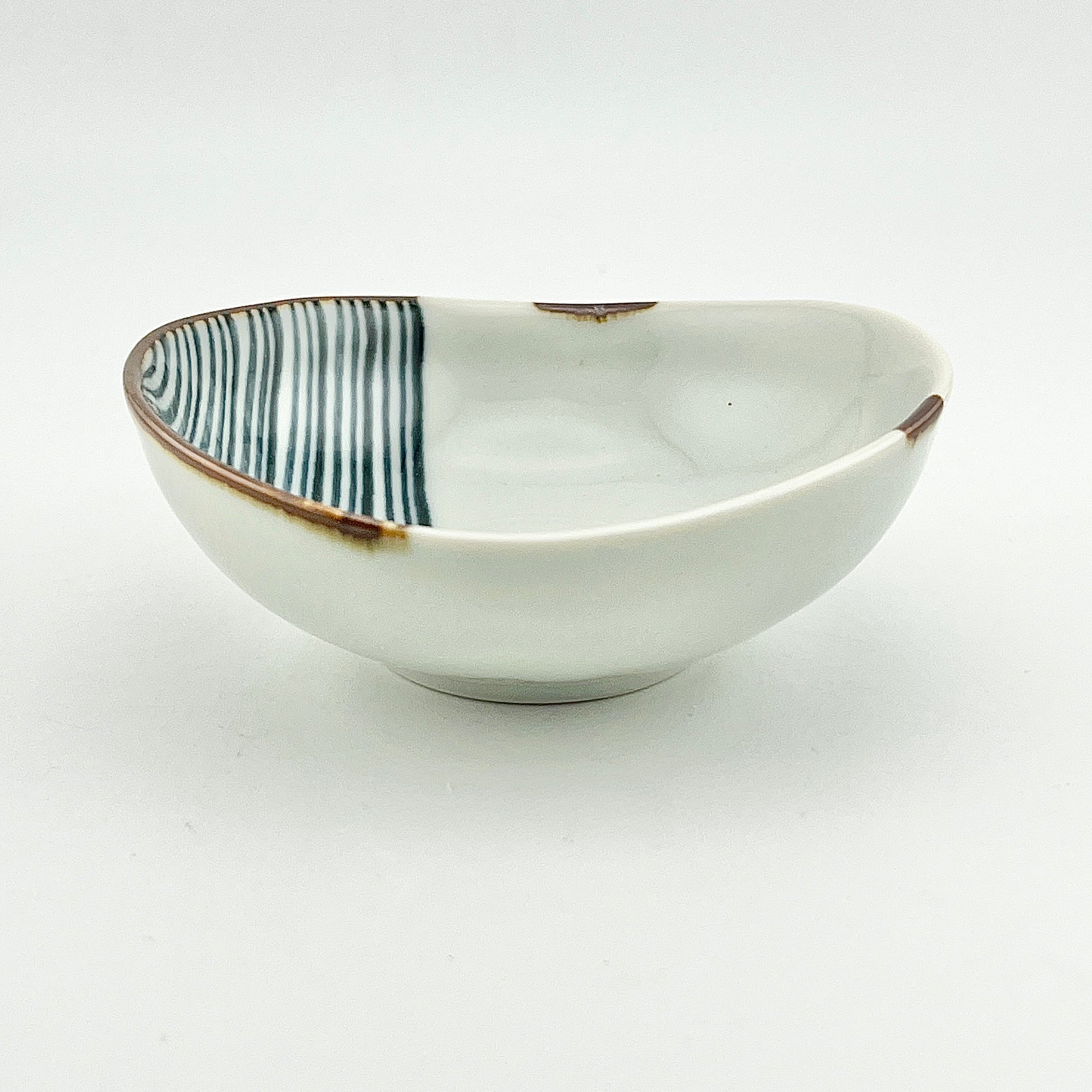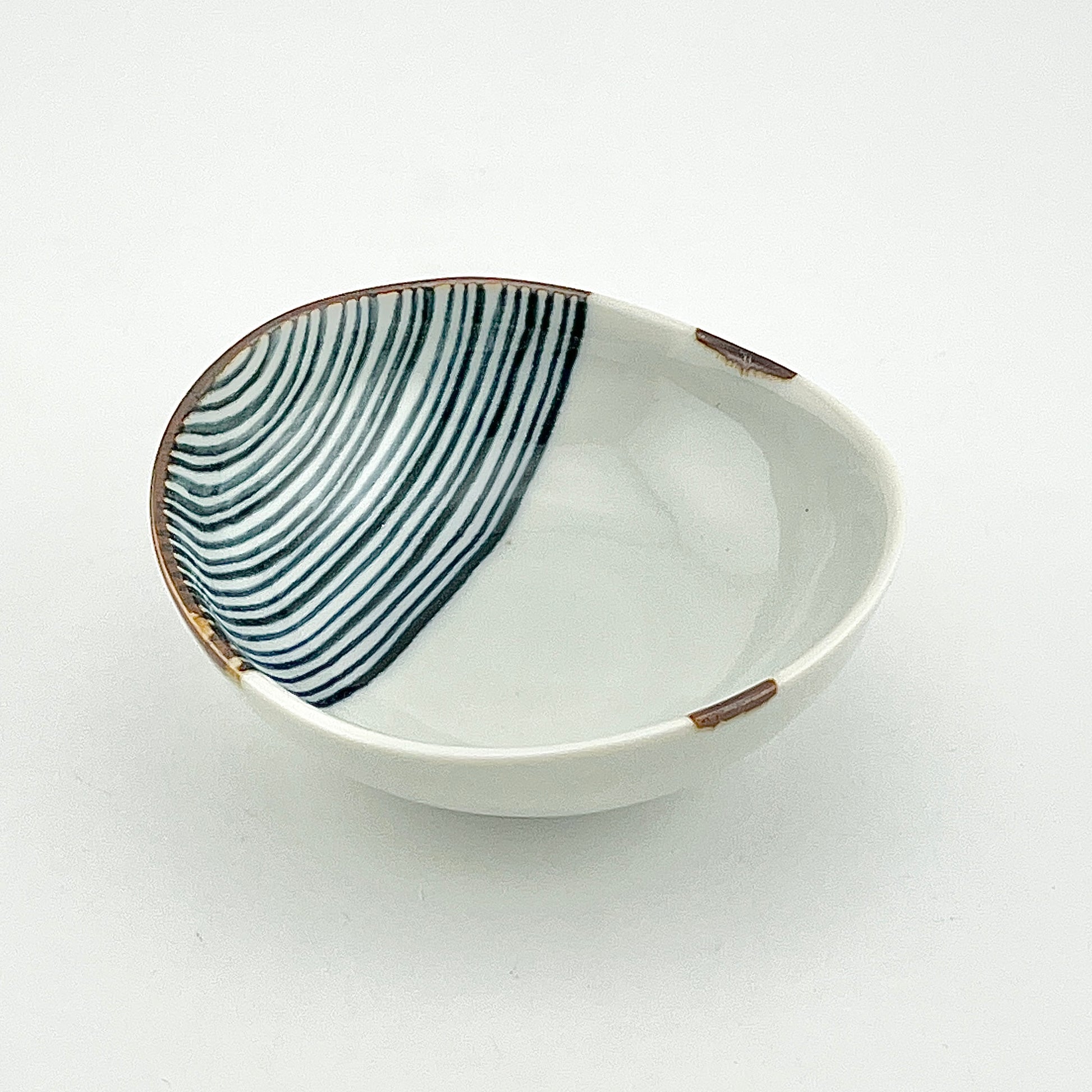 手描きの細いラインが、文字通り器の片側だけに施されたシンプルな小付です。