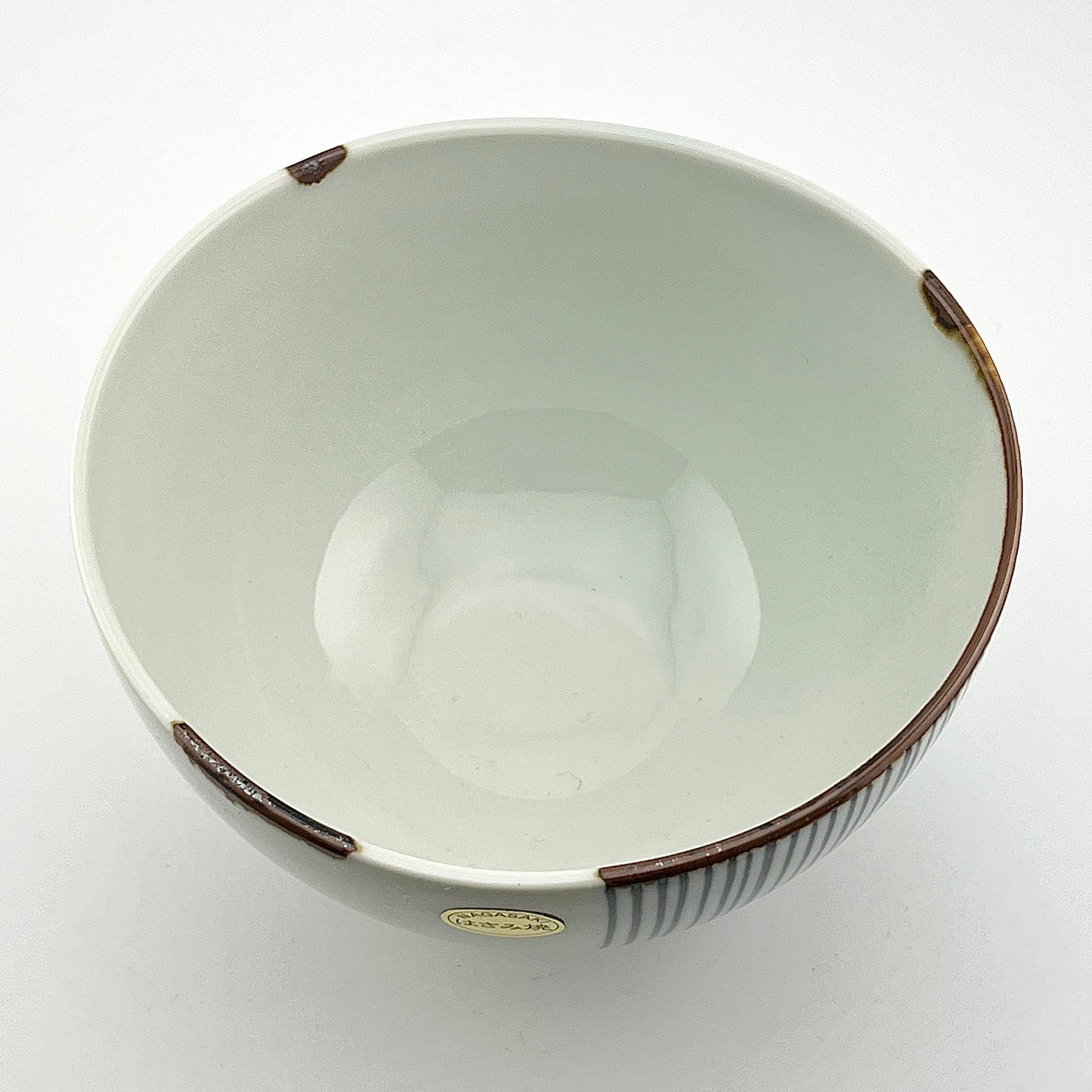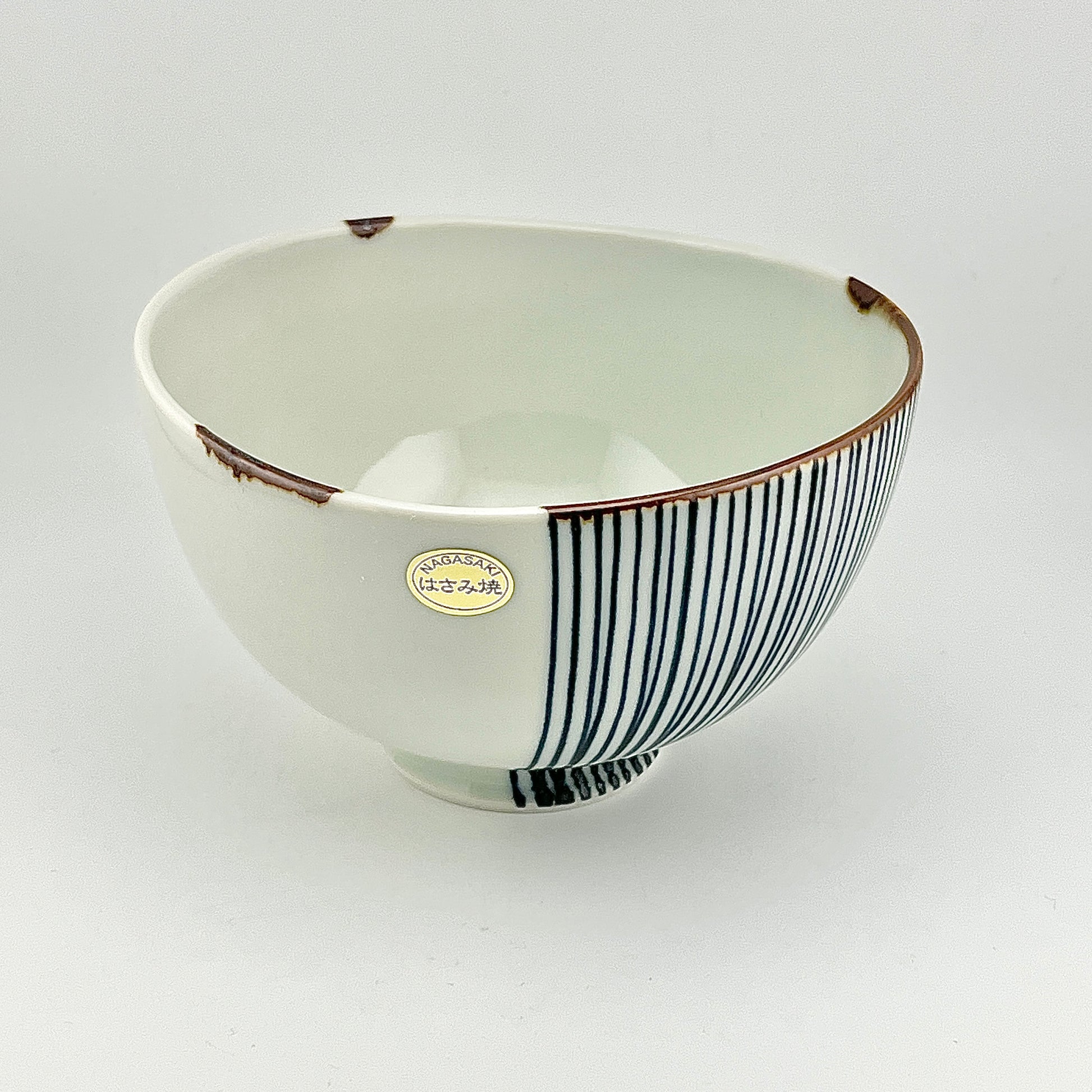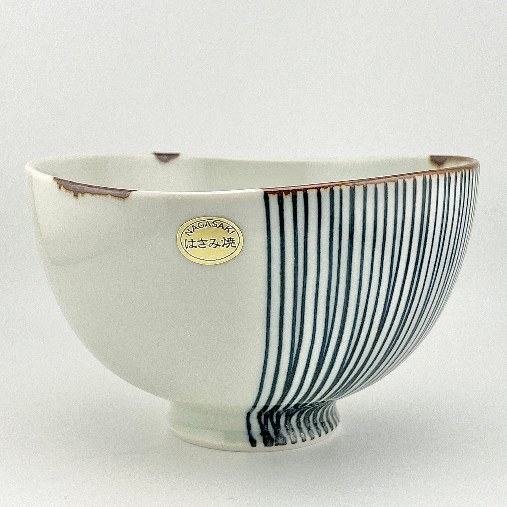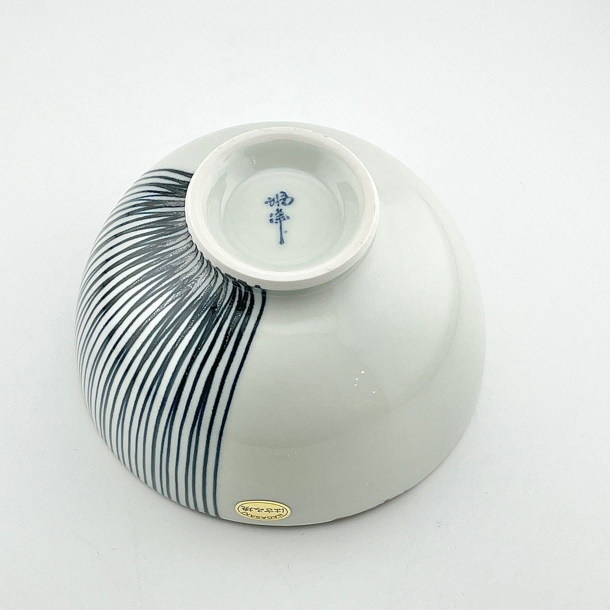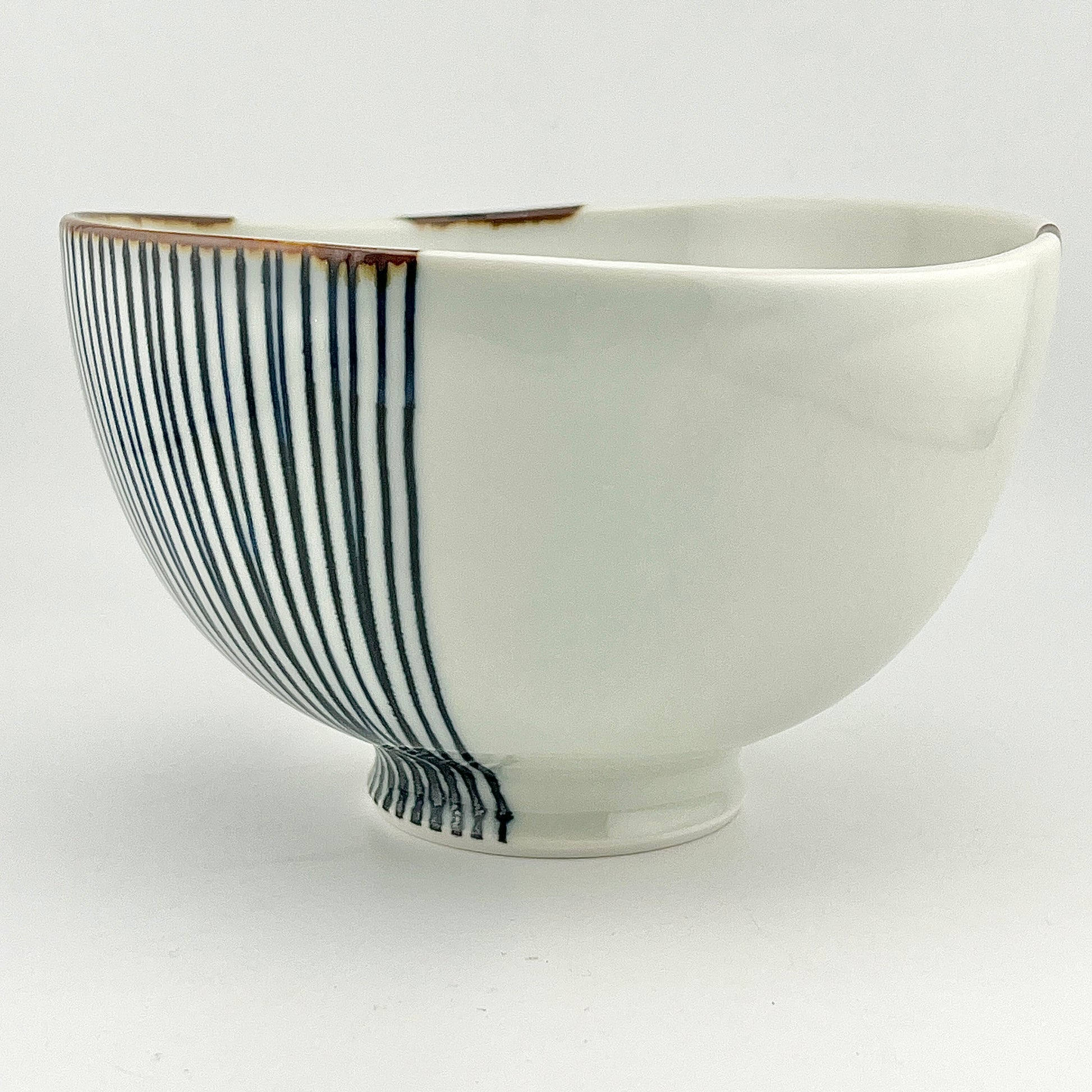 手描きの細いラインが、文字通り器の片側だけに施されたシンプルで小ぶりな丼です。