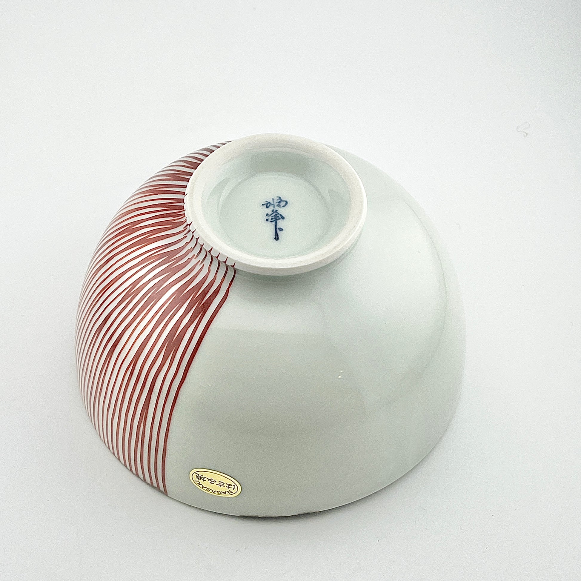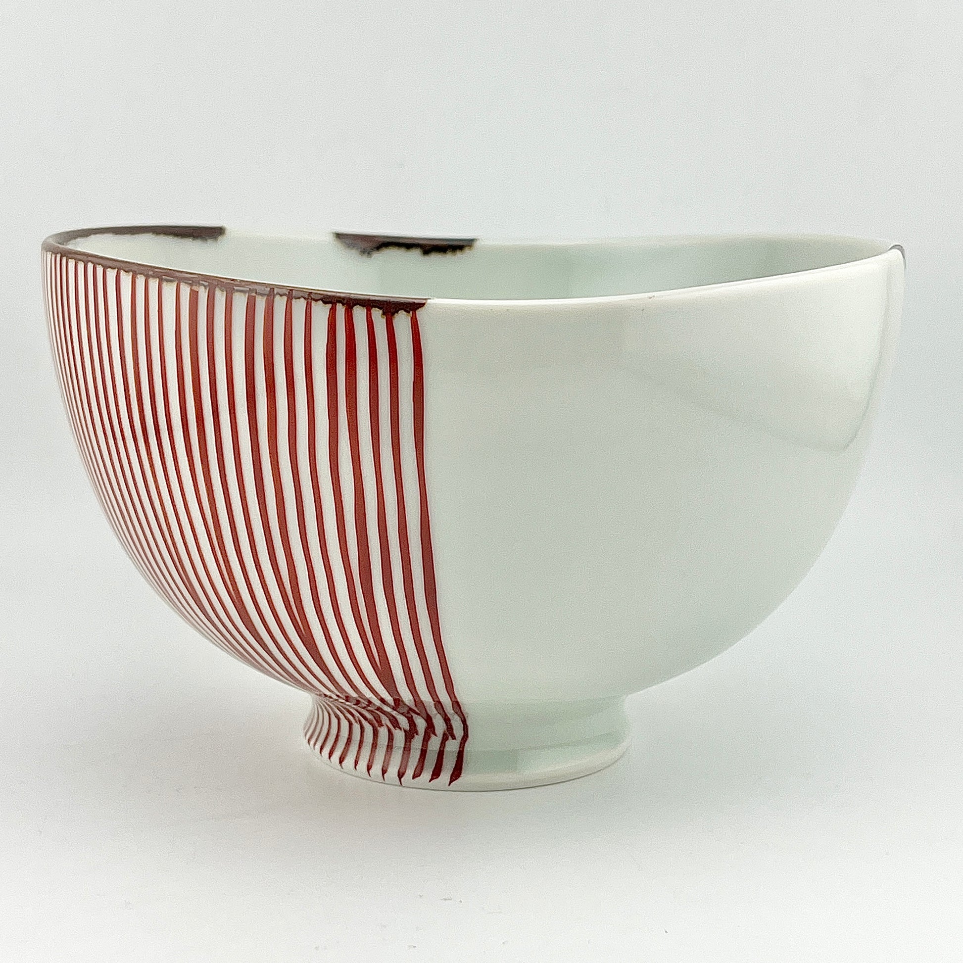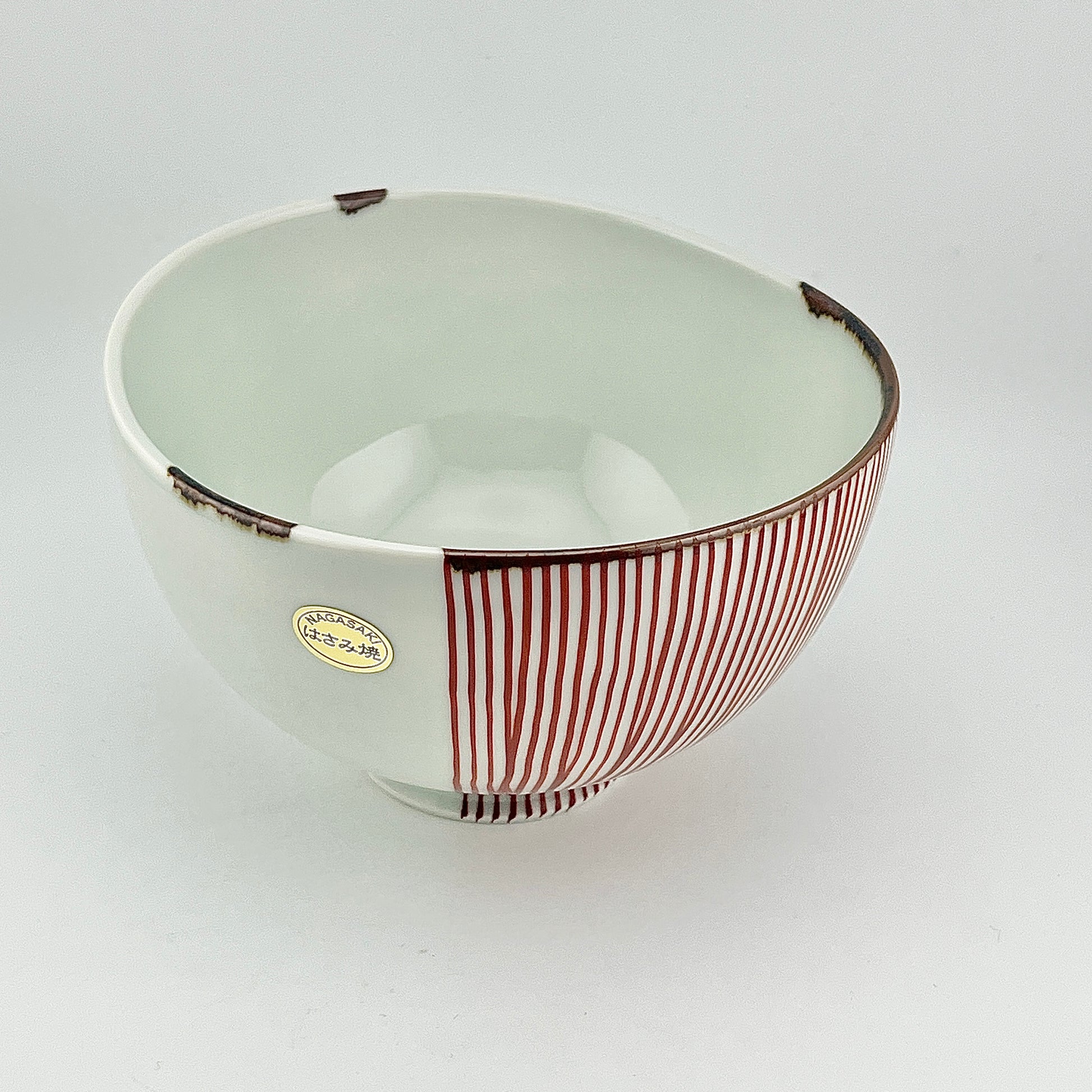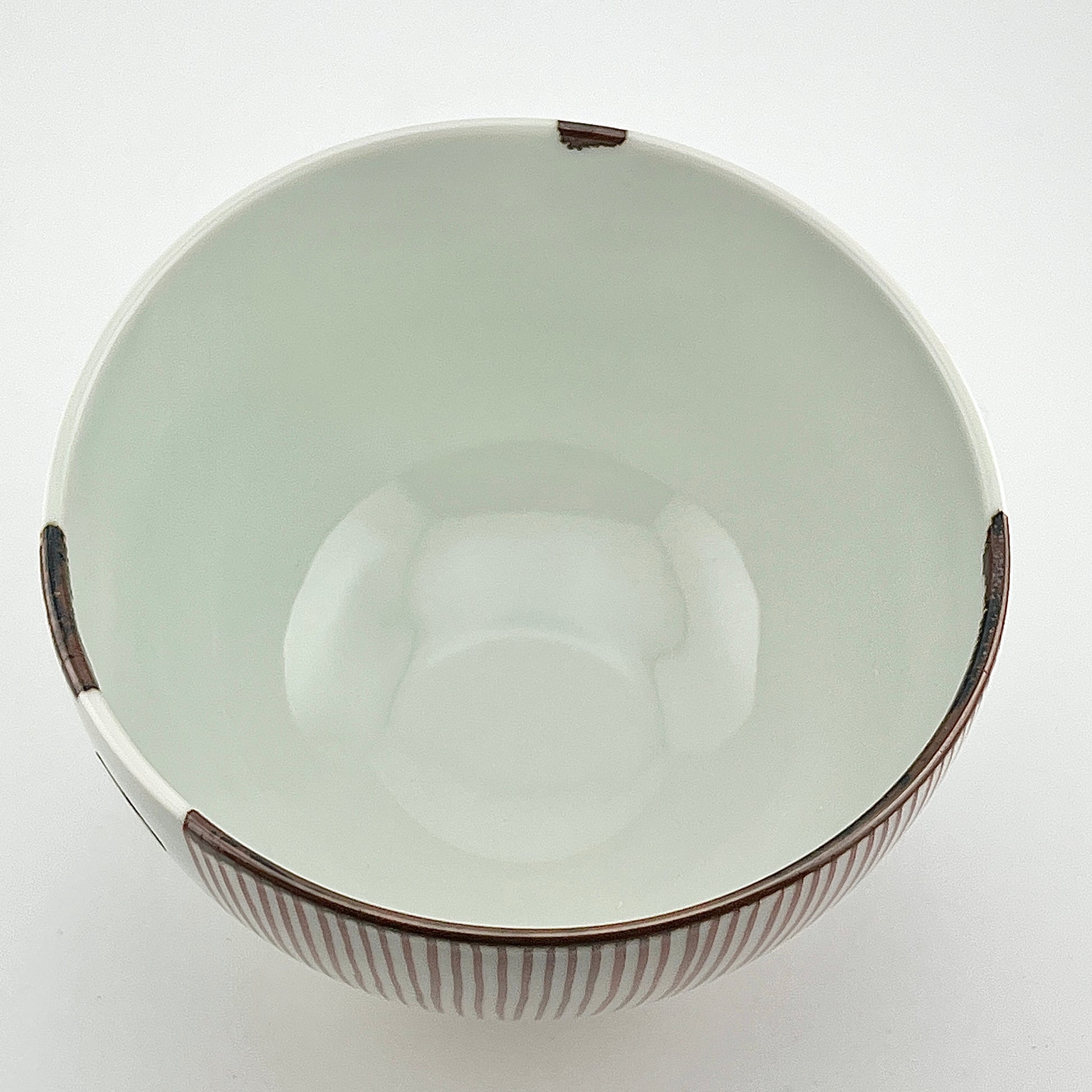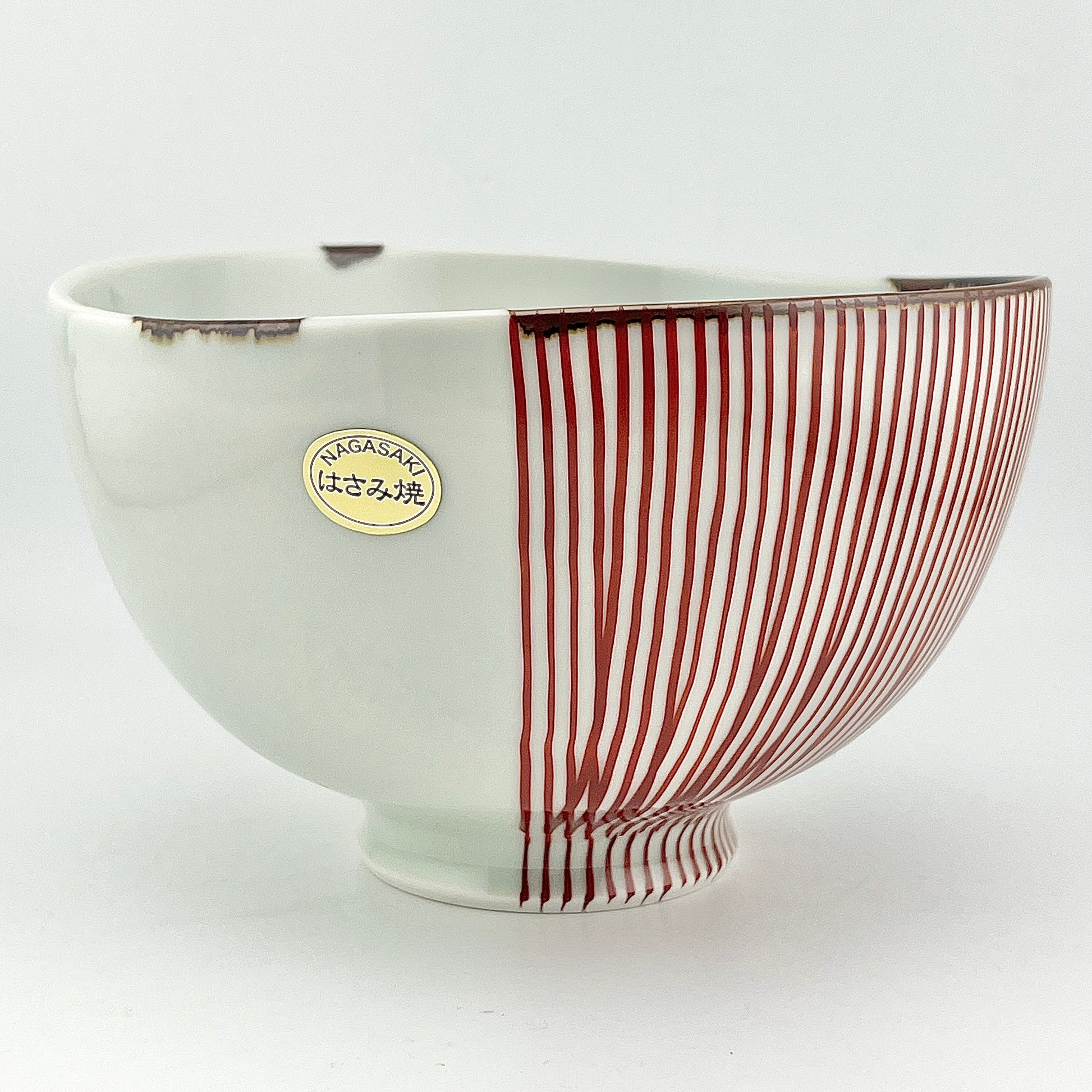 手描きの細いラインが、文字通り器の片側だけに施されたシンプルで小ぶりな丼です。